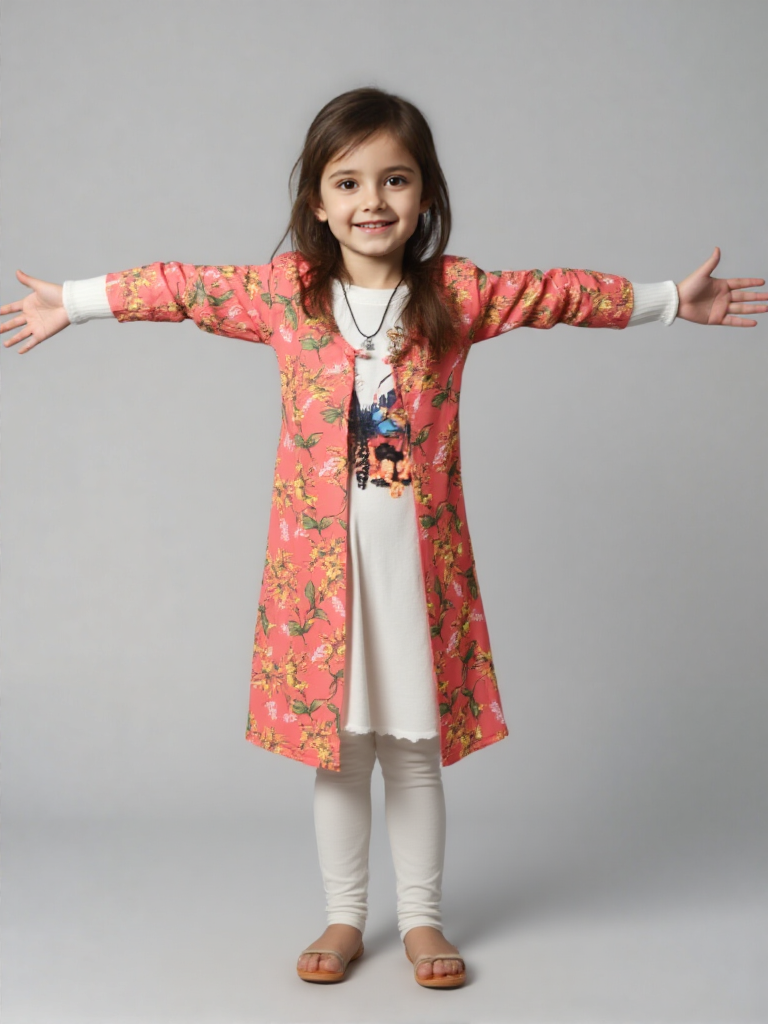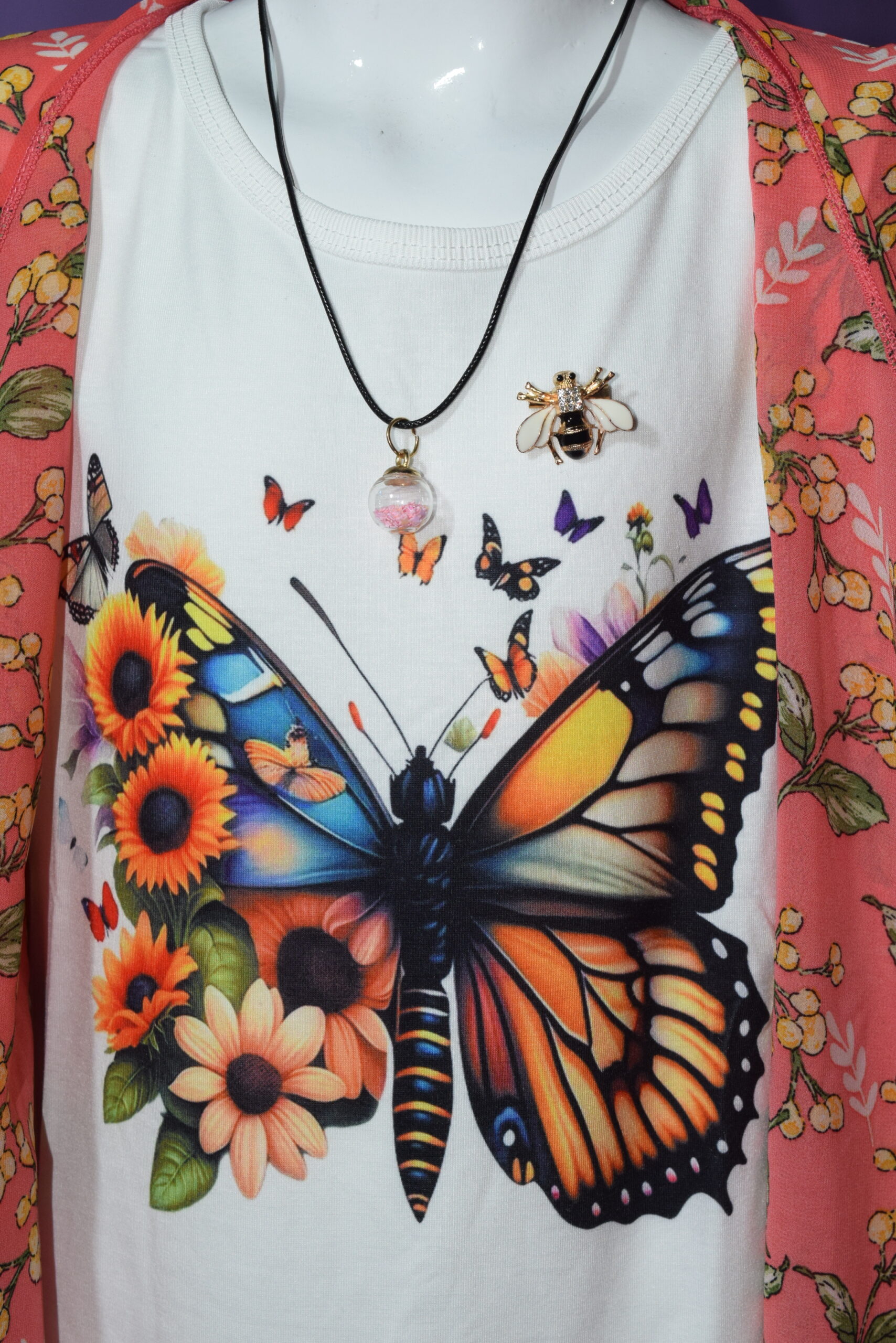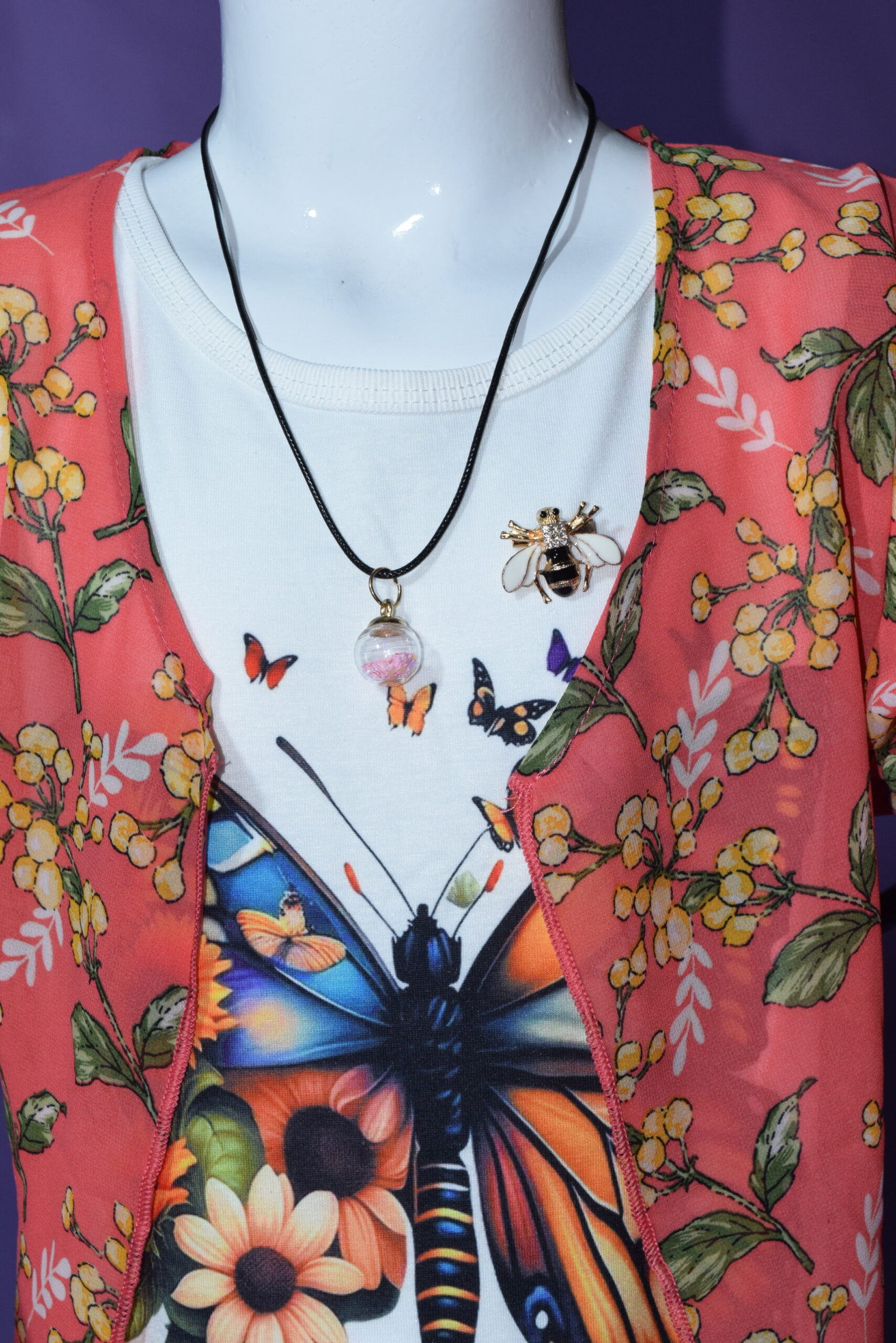 With a locket and High Quality Honey Bee Broach, Bright, feminine, and effortlessly stylish, this floral open-front cardigan brings a fresh pop of color to any outfit. Designed in a vibrant coral hue with delicate yellow blossoms and soft green leaves, it adds a cheerful, spring-inspired touch to your everyday wardrobe.