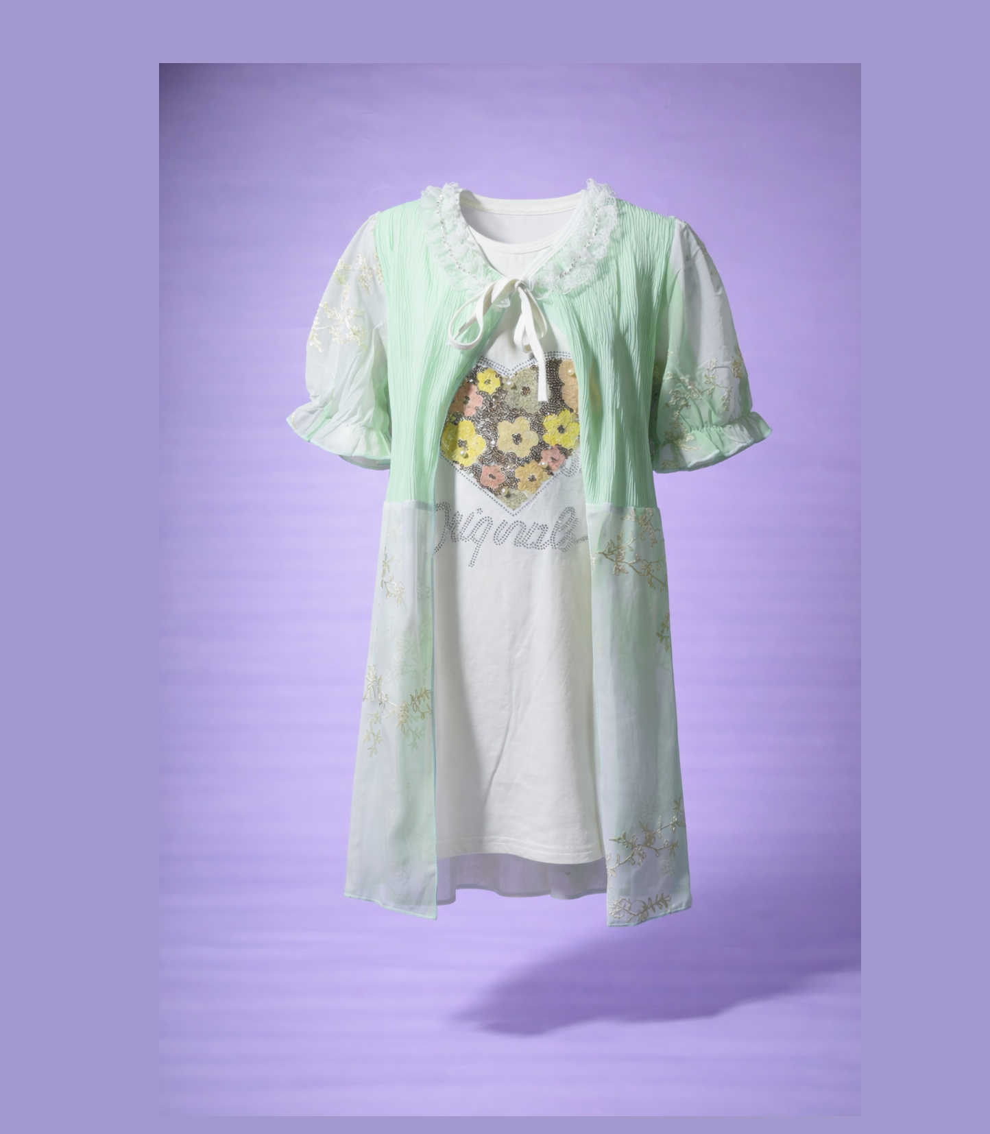 The delicate lace-trimmed neckline with a soft tie detail adds a feminine touch, while the floral heart embellishment at the front brings a sweet, eye-catching highlight. Sheer puff sleeves with subtle embroidery enhance the dreamy feel, making this dress perfect for special outings or everyday elegance.