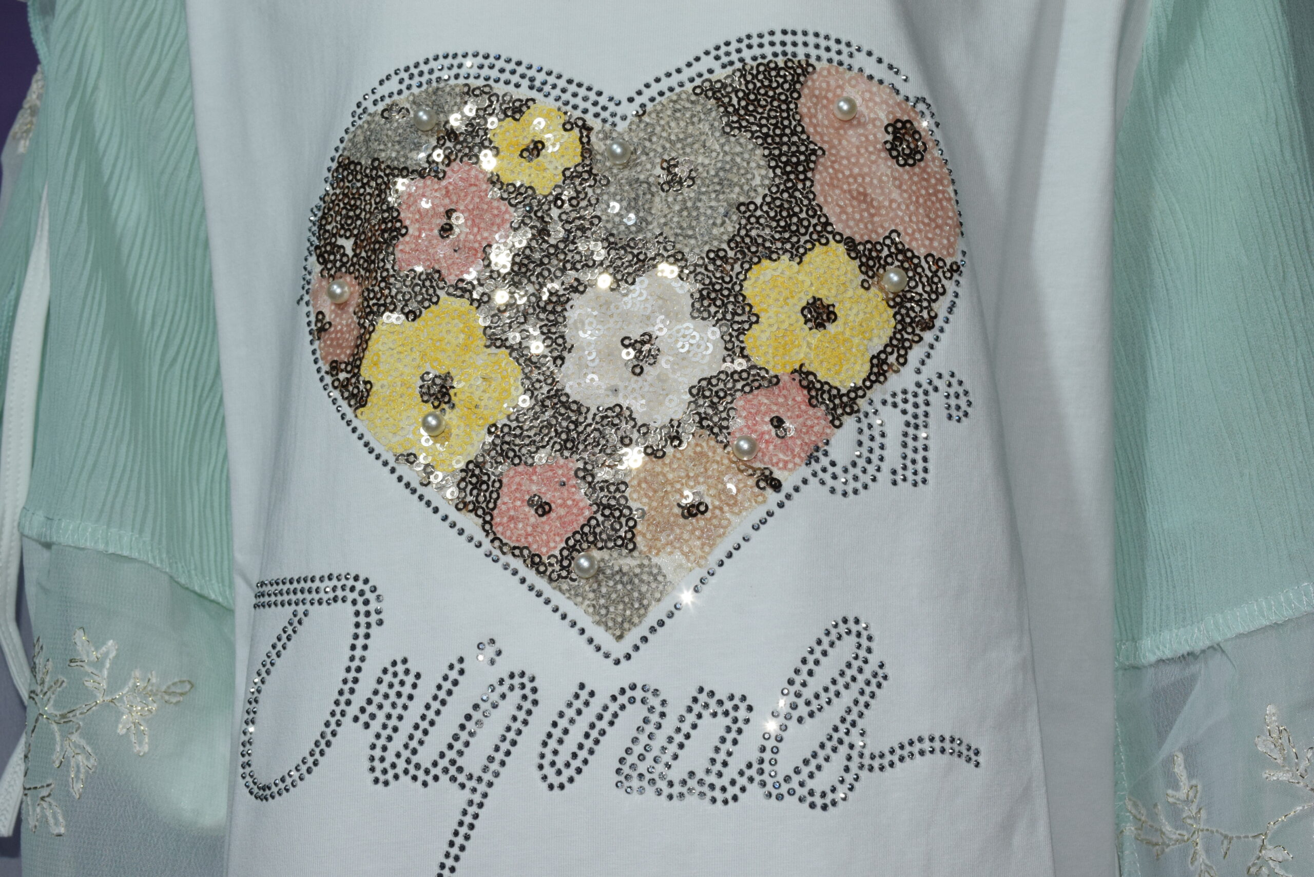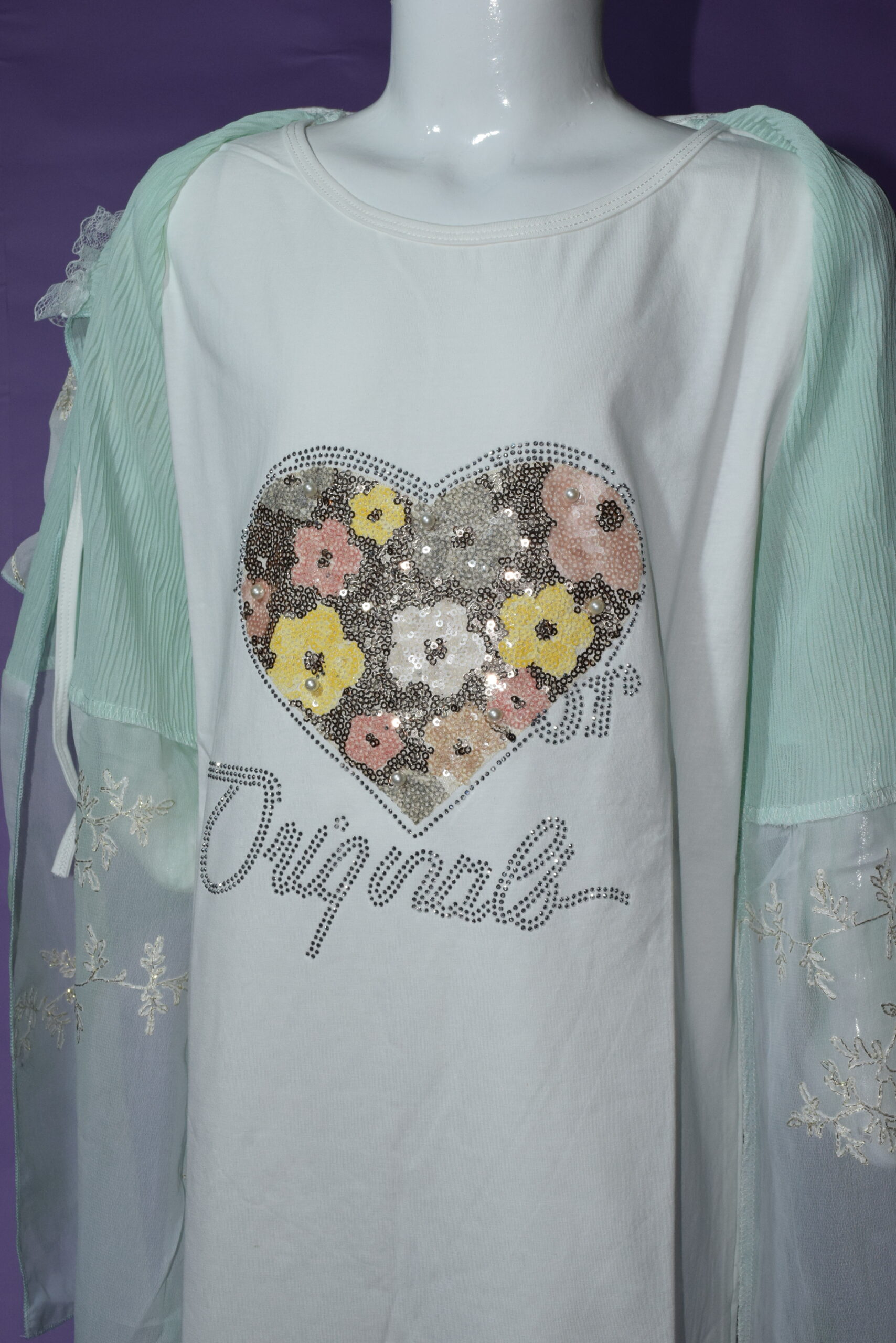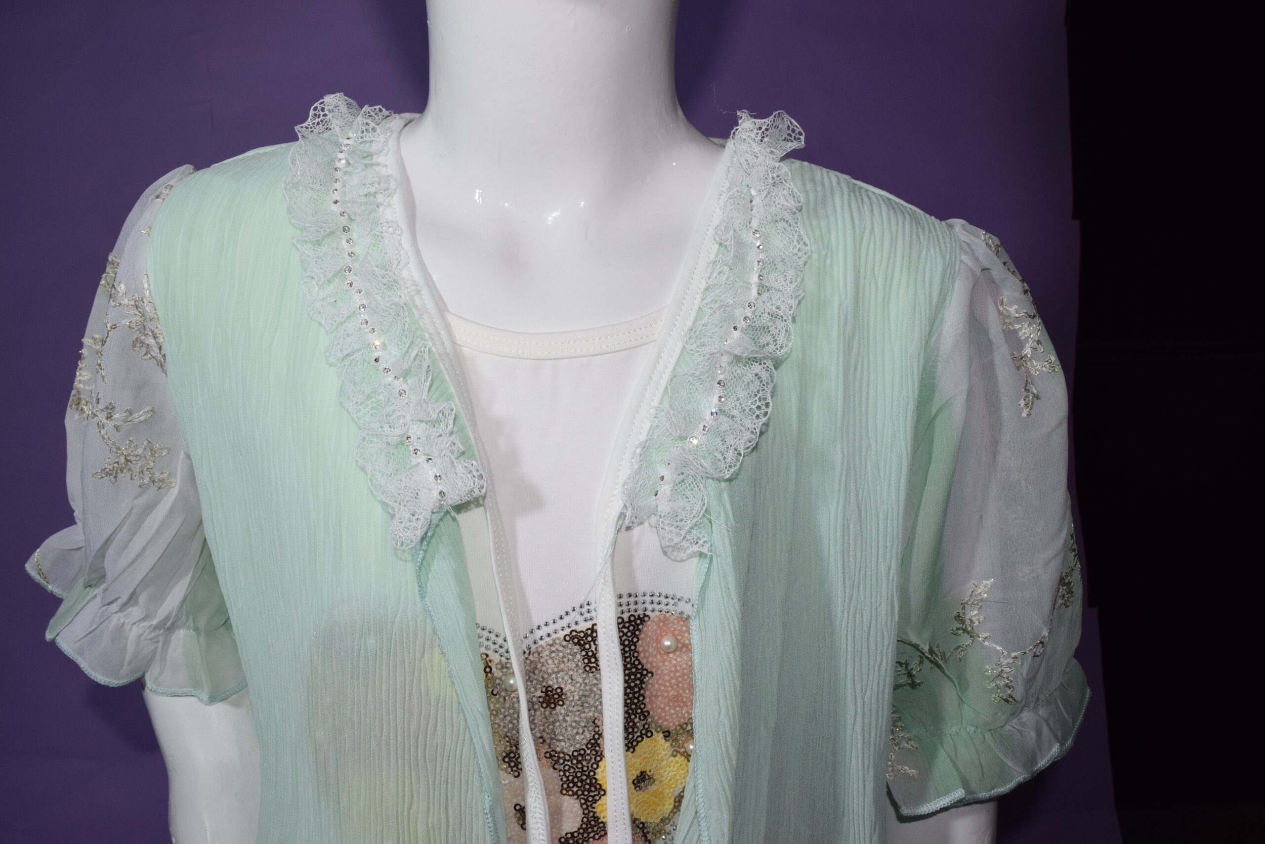 • Elegant sheer mint overlay with delicate embroidery