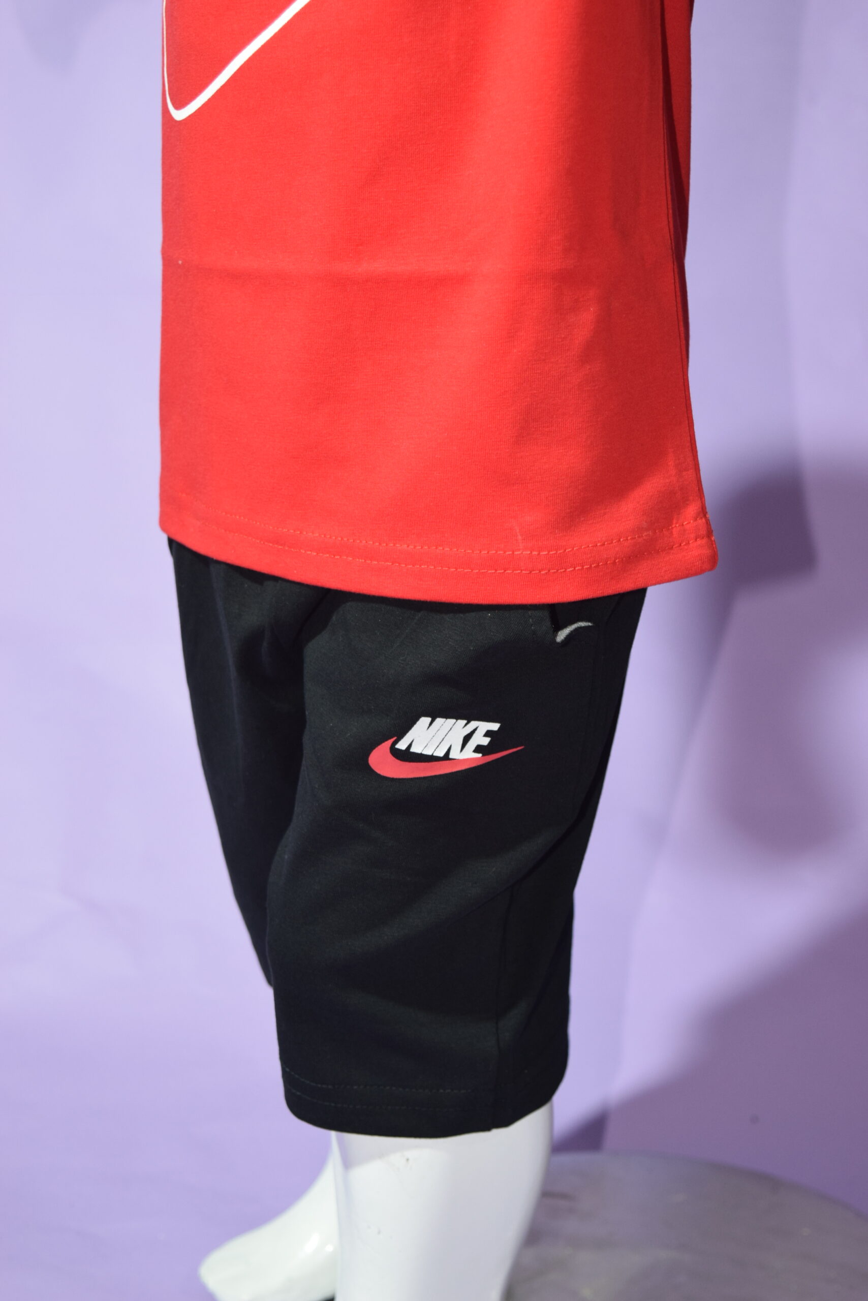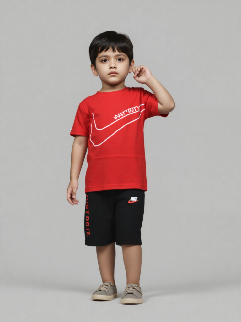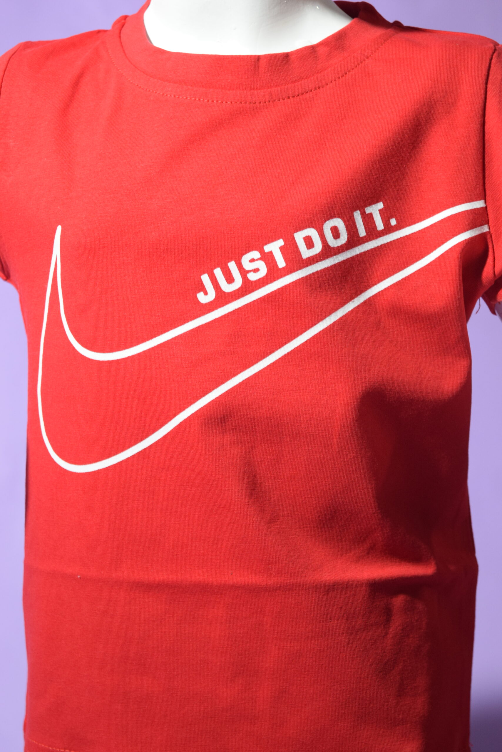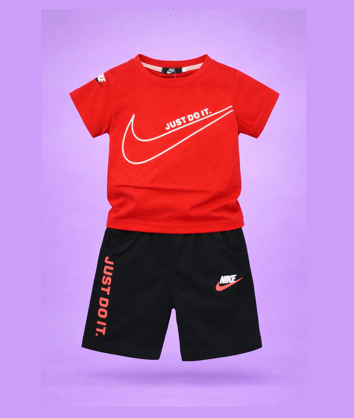 Sporty, bold, and built for action, this kids’ two-piece set delivers everyday comfort with iconic athletic style. The vibrant red short-sleeve tee features a striking swoosh graphic and motivational nike slogan across the front, adding an energetic edge to your child’s wardrobe.