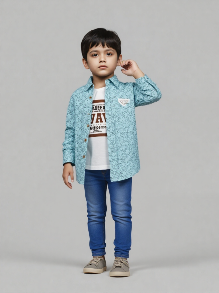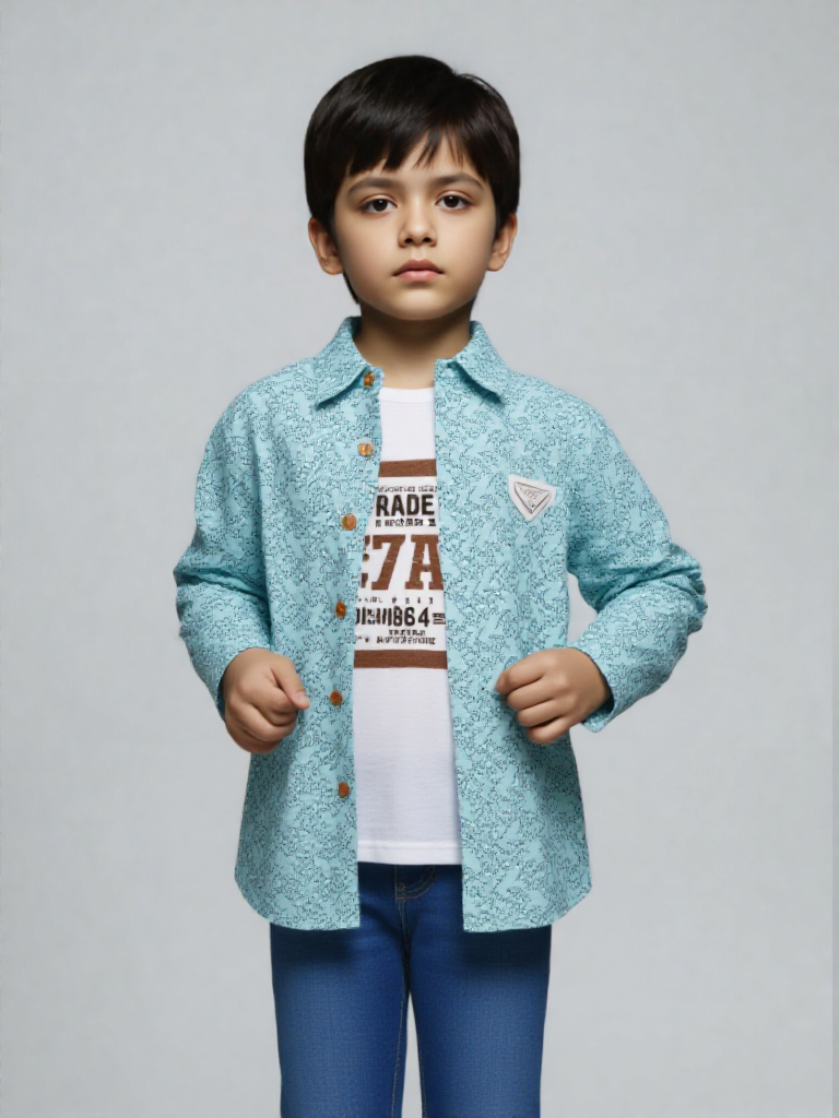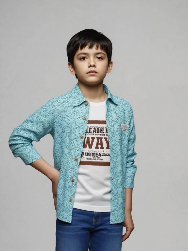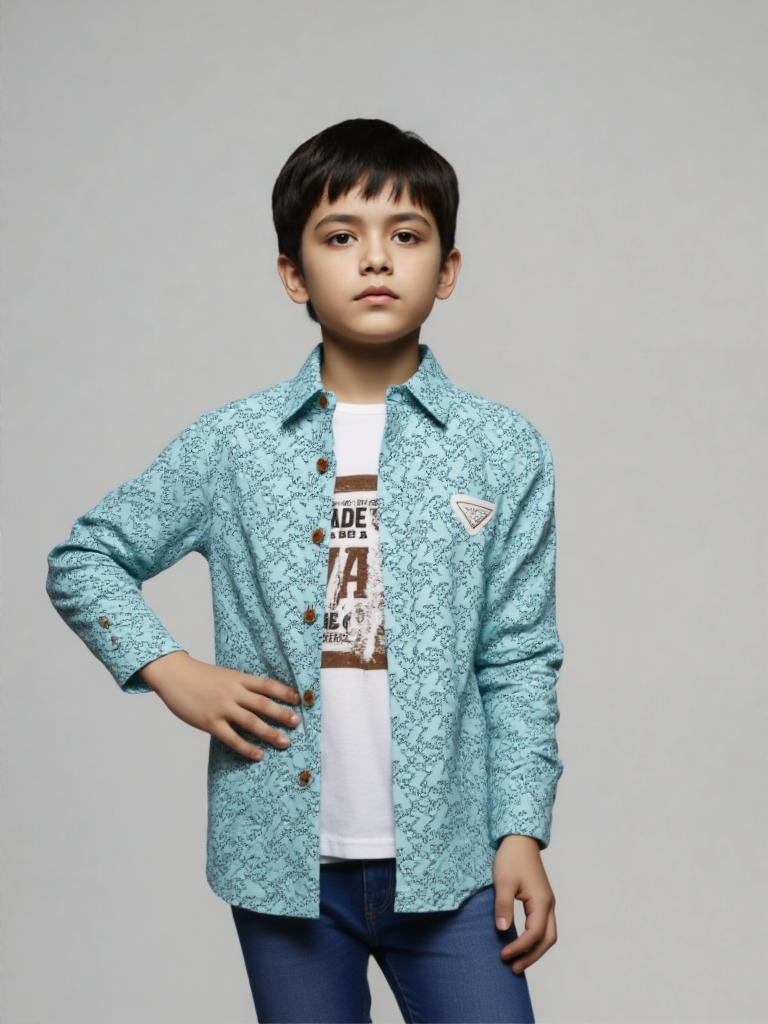 Upgrade his everyday style with this smart layered shirt set, designed for comfort and effortless fashion. Featuring a refreshing mint-blue button-down shirt with an all-over micro print, this piece adds a modern touch to any young wardrobe. The wooden-style buttons and structured collar enhance its polished look, while the subtle chest badge detail gives it a trendy finish.