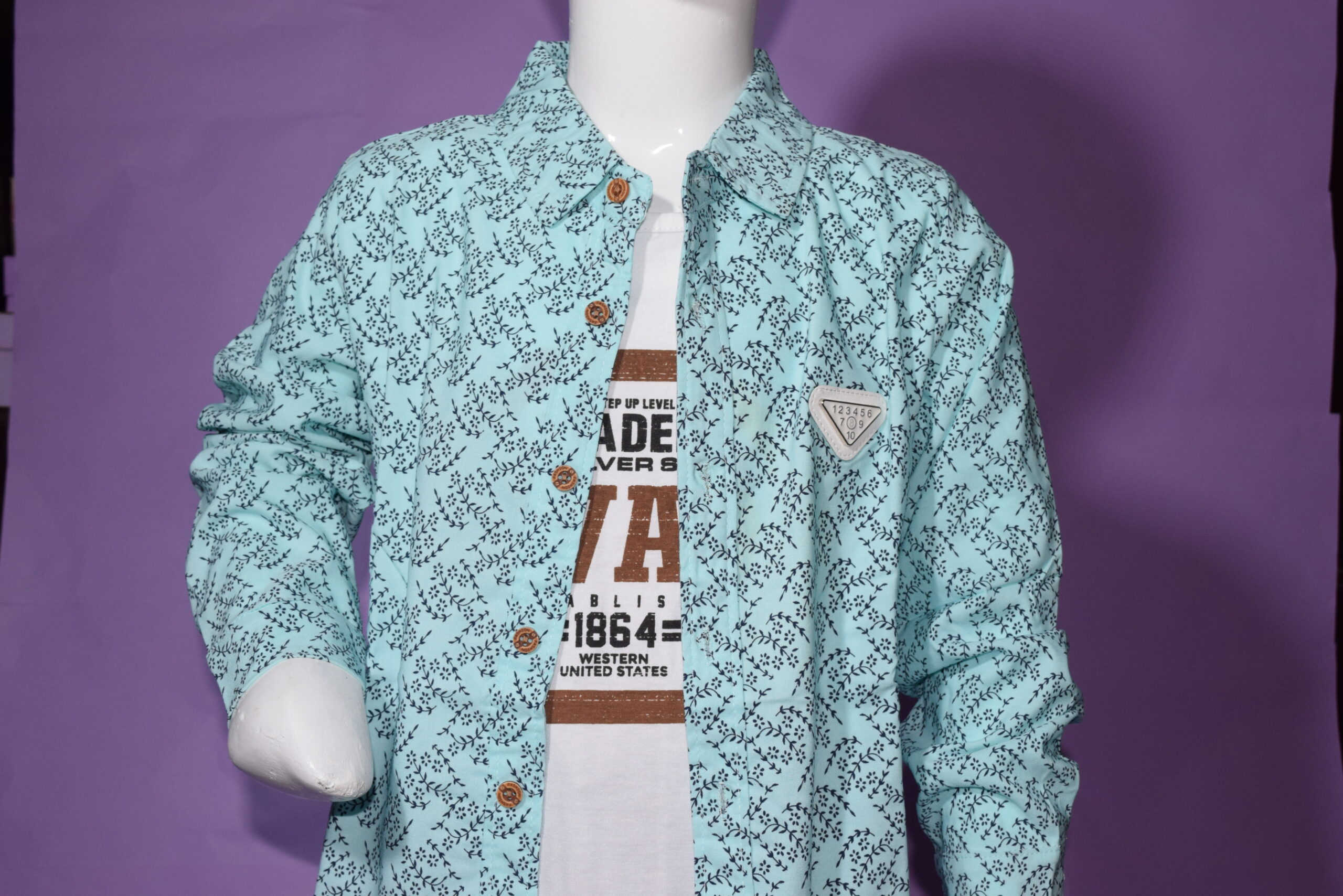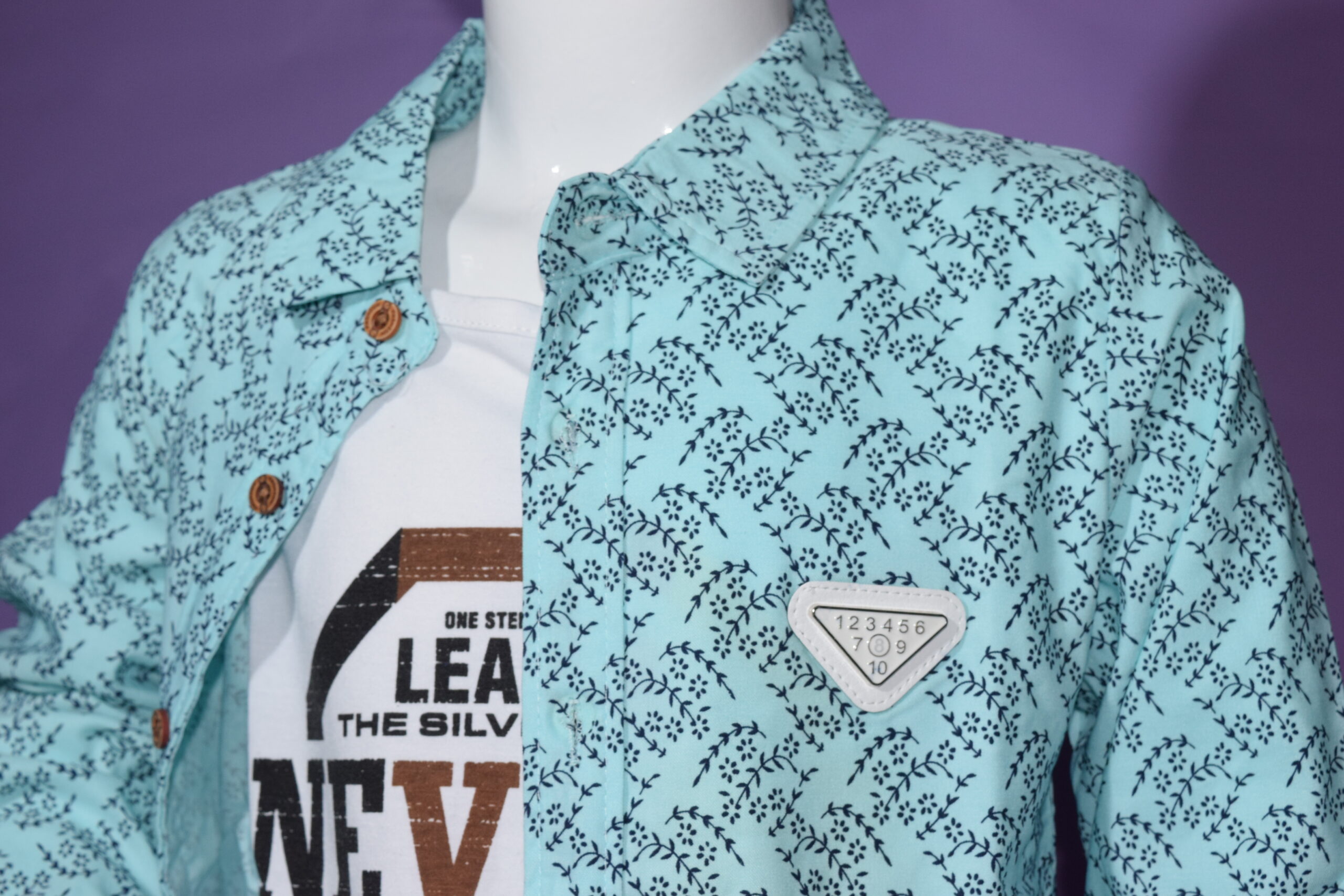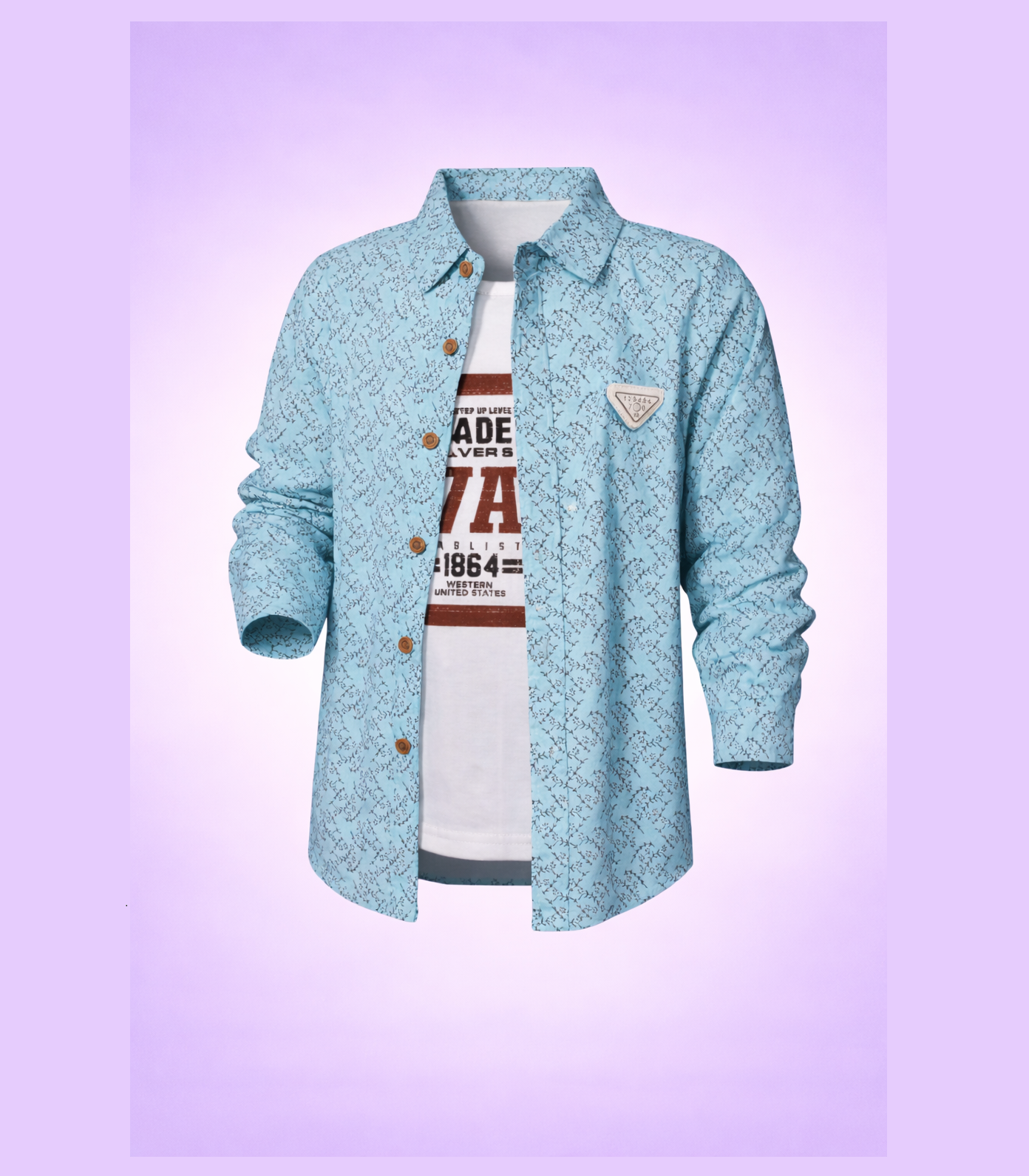 Upgrade his everyday style with this smart layered shirt set, designed for comfort and effortless fashion. Featuring a refreshing mint-blue button-down shirt with an all-over micro print, this piece adds a modern touch to any young wardrobe. The wooden-style buttons and structured collar enhance its polished look, while the subtle chest badge detail gives it a trendy finish.