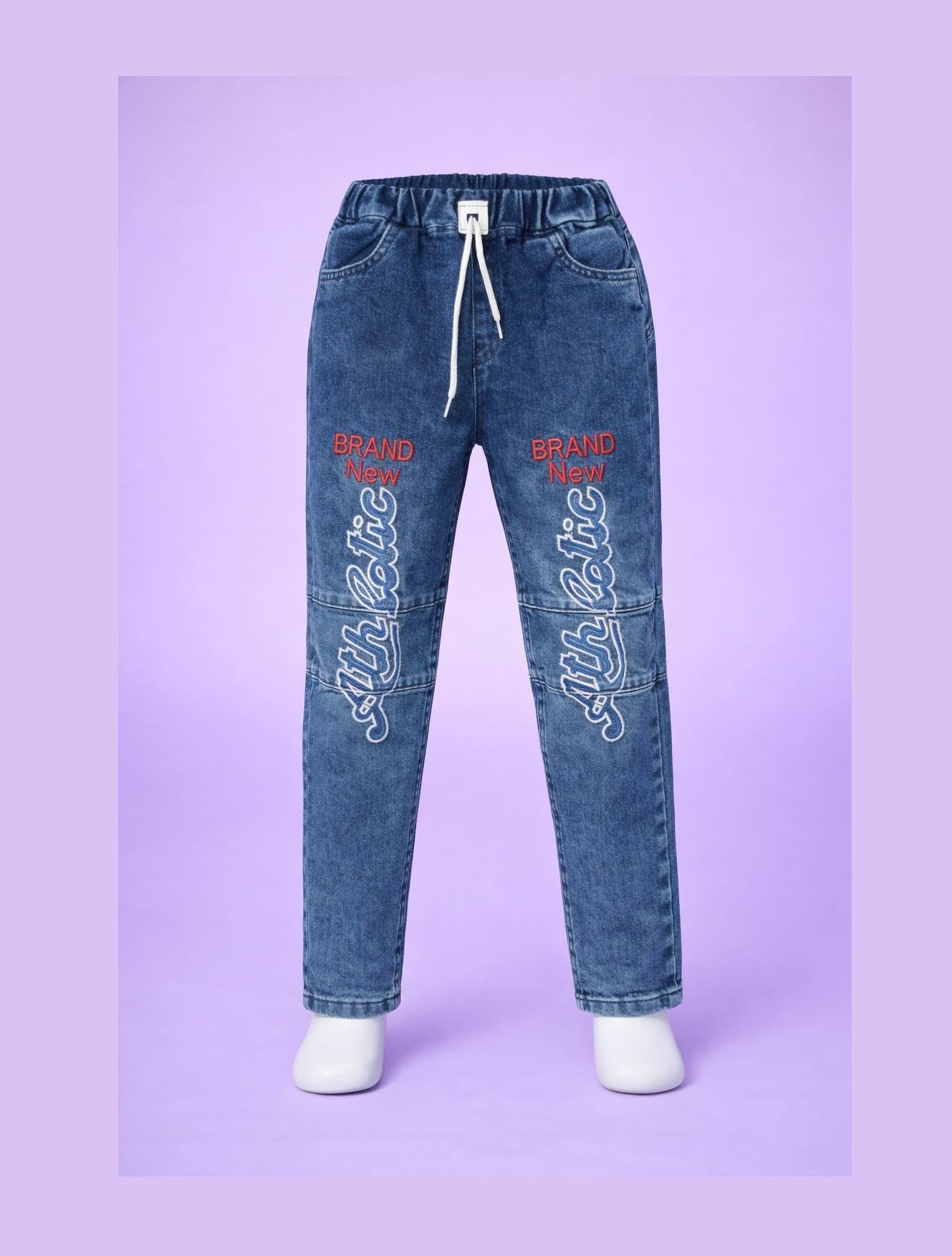 Add a bold street-style vibe to your little one’s wardrobe with these trendy printed denim jogger jeans. Designed with a modern tapered fit and eye-catching “Brand New Athletic” print on both legs, these jeans bring comfort and cool together in one stylish piece.